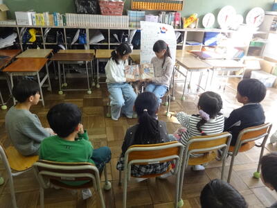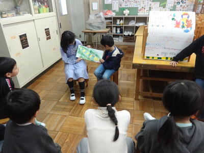 3年生が1年生を招待し、グループごとにおすすめの本を紹介しました。