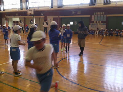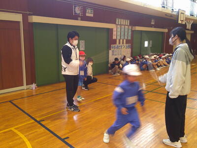 1年、3年、なかよしが体育館で八の字跳びを