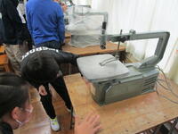図工では、糸のこを実際に自分たちで取りつけて使い方を学んでいます。