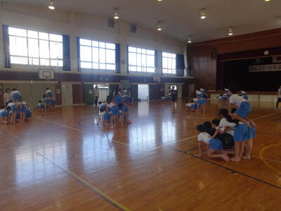 高学年組体操の練習が体育館で行われ、様々な隊形への移動、集団演技や2人組、3人組演技に磨きをかけていました。集中して取り組み、みんなの心が一つになっている感じが伝わってきました。いい作品になりそうです。