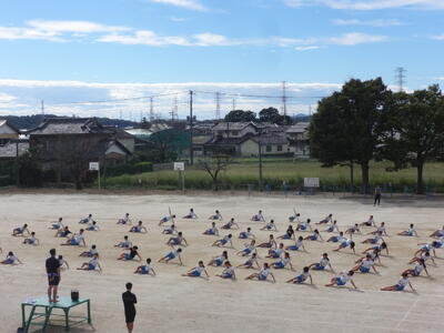 高学年組体操の練習が第1校時から校庭で行われました。隊形移動、異動後との表現演武、組体操技等