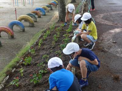 雨が降った後の湿った学校園の土をほり、様々な花の苗を植えました。ありがとうございました。そして今日からは露地栽培になります。東児玉小学校の校内がたくさんの花できれいになるよう、花の世話もよろしくお願いします。