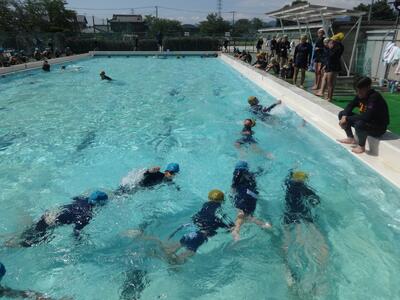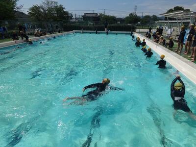 早いもので、来週から7月に入ります。プールもいよいよ終盤戦、残り水泳学習の時間が少なくなりました。そんな中、高学年の水泳学習の授業では、プールを1分間で何週できるか、遠泳に挑戦していました。もしもの時のために、速く泳ぐことよりも、少しでも長く泳いでいられる、遠くまで泳げることも大切だと思います。5,6年生はみんな夢中になって泳いでいました。