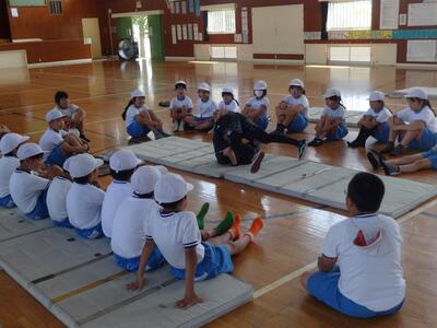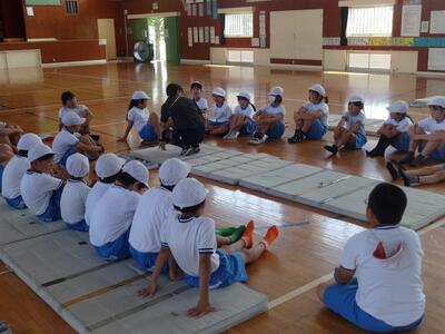 本校は今年、「児童と共に行動しポイントを押さえた指導の充実」に取り組んでおります。今日の4年生の体育でも、開脚後転の模範演技を、ポイントを説明しながら、担任の先生が教えていました。演技が終わると児童からは拍手があがりました。